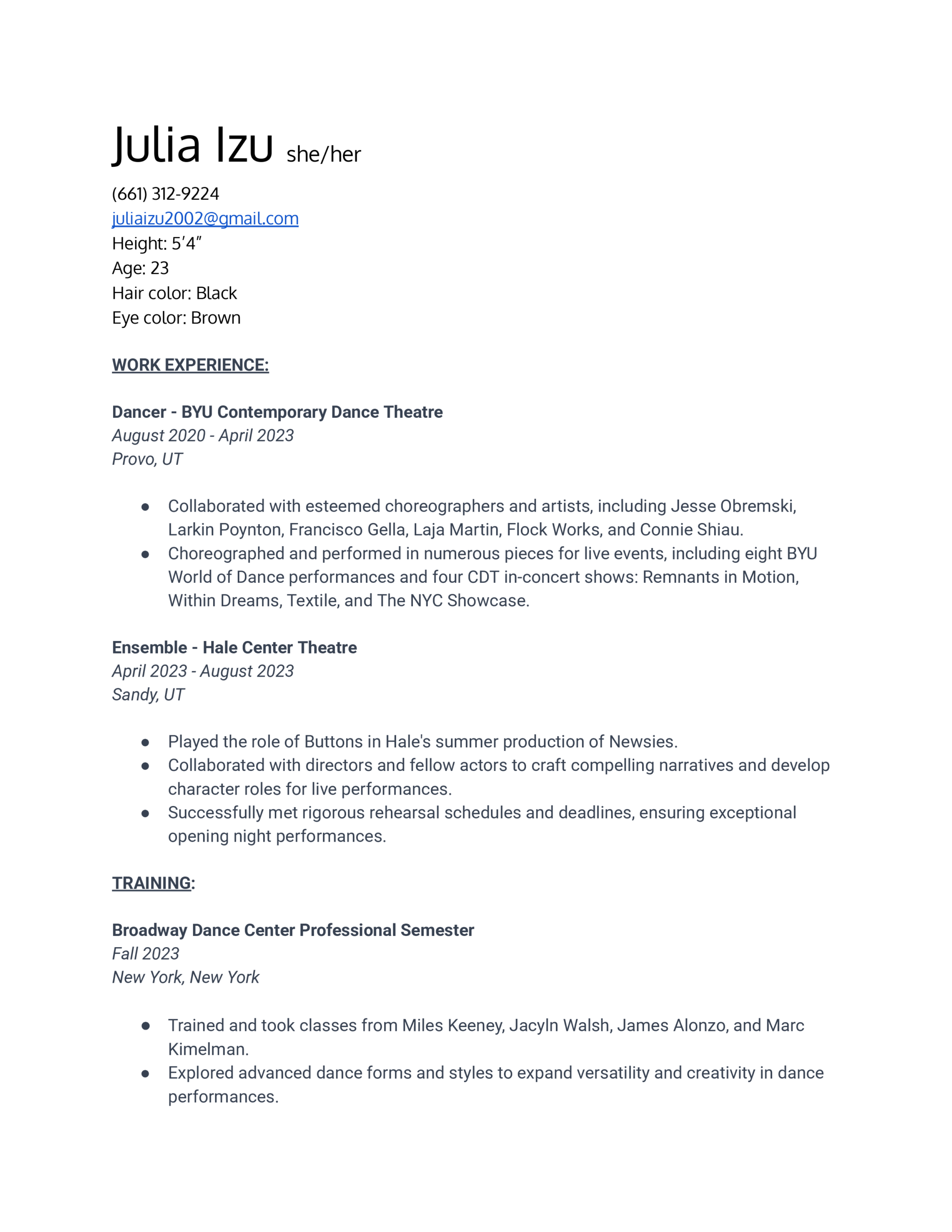 She continued her academic and creative pursuits at Brigham Young University, earning a BA in Communication Studies with a Minor in Contemporary Dance. Soon after, she relocated to New York City to broaden her professional dance training and was selected for Broadway Dance Center’s Professional Semester in Fall 2023. She has remained in New York since, consistently training, performing, and engaging with the city’s dynamic arts community. Julia also returns to California frequently and values the opportunity to take class and remain connected to her roots on the West Coast.